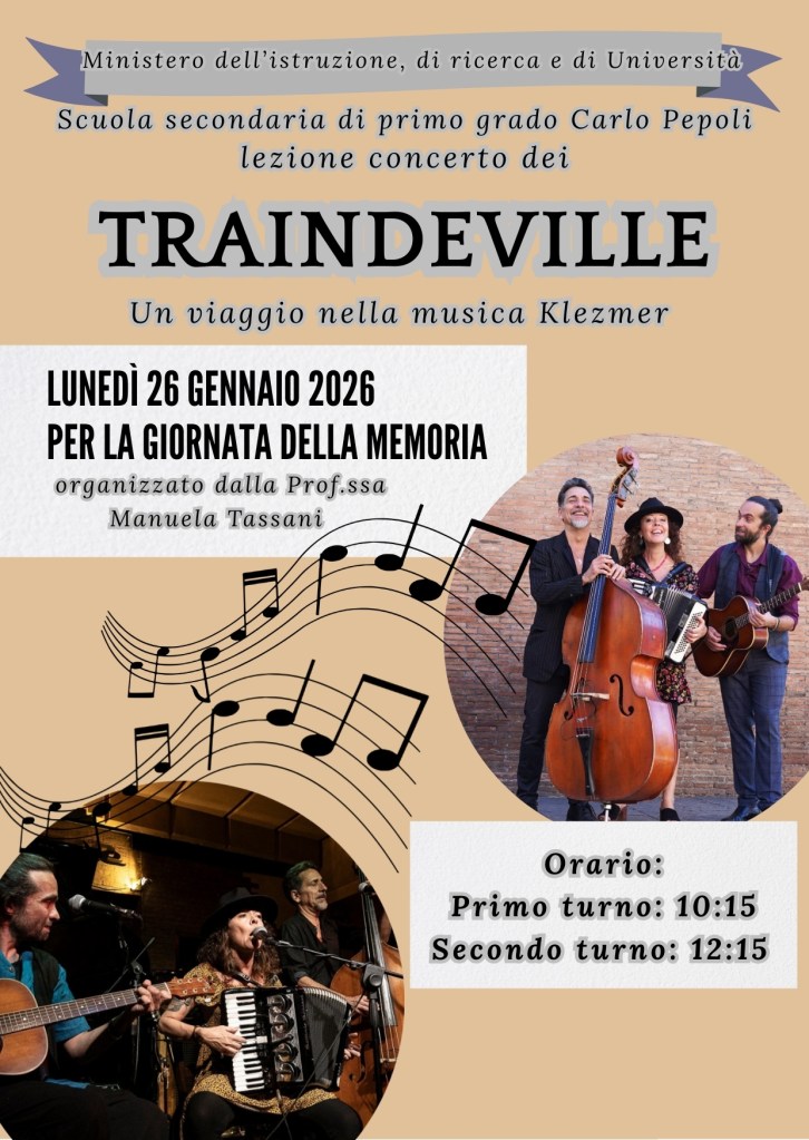 Lunedì 26 gennaio 2026 il trio incontrerà gli alunni della Scuola secondaria di primo grado Carlo Pepoli di Bologna per un concerto all’insegna della Memoria e alla importante eredità culturale delle canzoni in yiddish e della musica klezmer con tutta la loro carica di vitalità e di resistenza.
