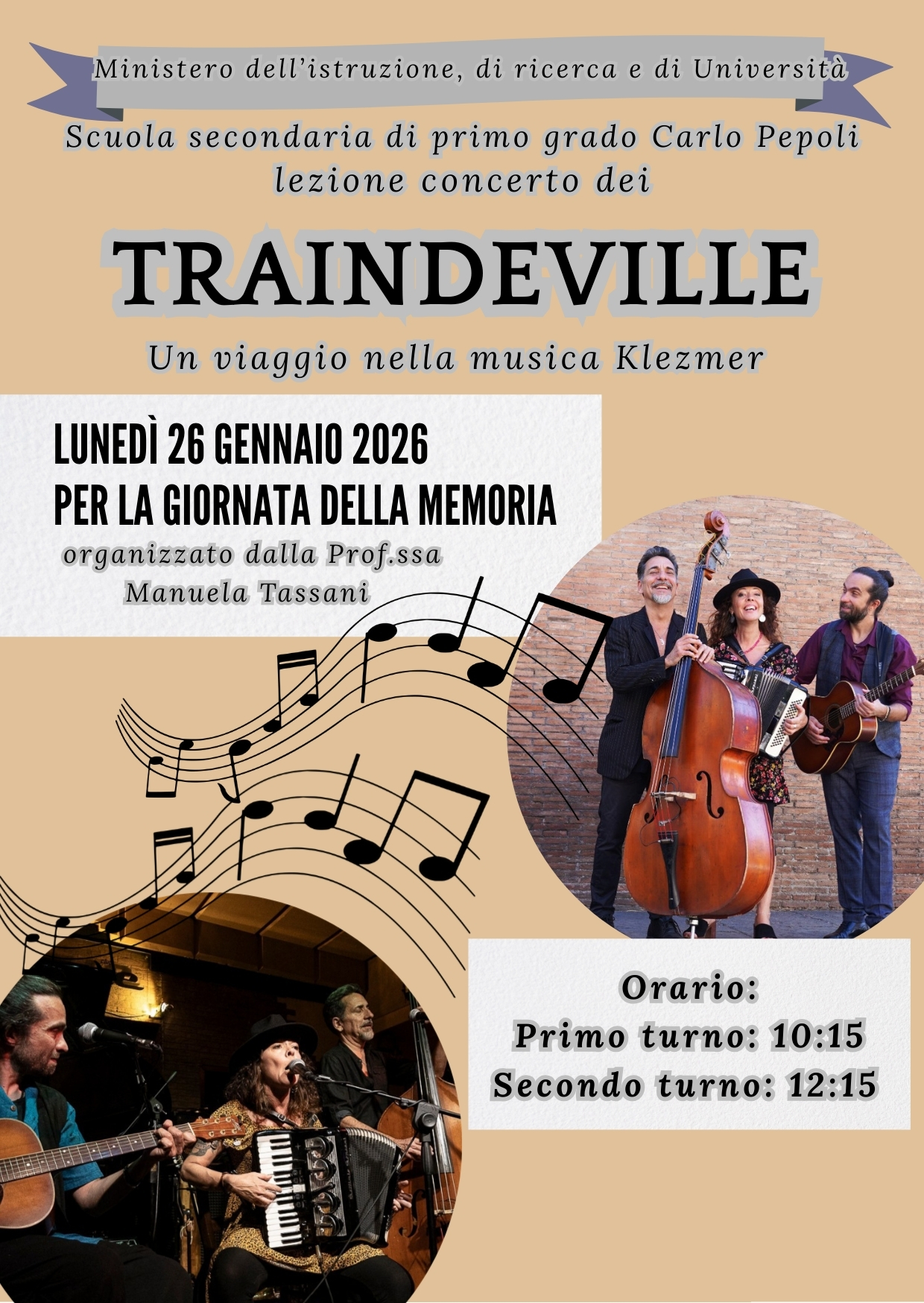 Lunedì 26 gennaio 2026 il trio incontrerà gli alunni della Scuola secondaria di primo grado Carlo Pepoli di Bologna per un concerto all’insegna della Memoria e alla importante eredità culturale delle canzoni in yiddish e della musica klezmer con tutta la loro carica di vitalità e di resistenza.